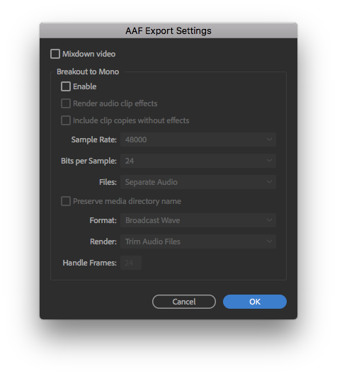 AAF export settings should be chosen in consultation with your audio post team! This is what we used for this test.