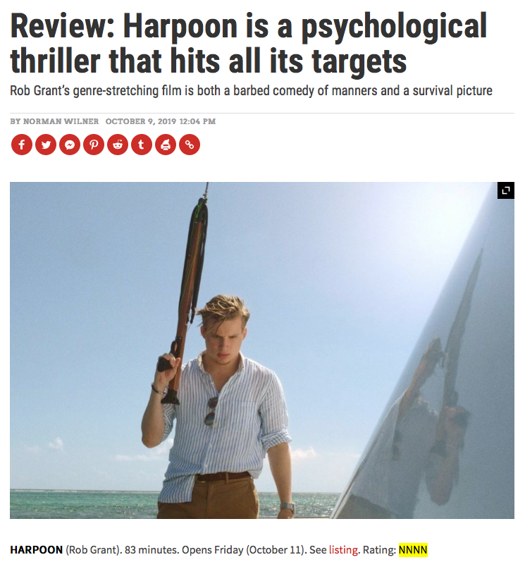Rob Grant’s HARPOON gets a theatrical release this week, and has received some great press in places like GQ and IGN. It was especially gratifying to read this NNNN review in NOW Magazine, the Toronto alt-weekly I grew up reading.